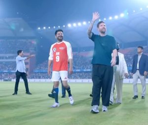 মেসির যখন মাঠে প্রবেশ করছেন, তখন প্রদর্শনী ফুটবল ম্যাচ চলছিল। দুই সতীর্থ লুইস সুয়ারেজ এবং রদ্রিগো ডি পলকে নিয়ে মেসি ভিভিআইপি বক্সে দাঁড়িয়ে সেই ম্যাচ দেখেছেন। কয়েকবার উচ্ছ্বসিতও দেখা যায় বিশ্বকাপজয়ী আর্জেন্টাইন অধিনায়ককে। মেসি স্টেডিয়ামে আসার পরই মাঠে নামেন তেলেঙ্গানার মুখ্যমন্ত্রী রেবন্ত রেড্ডি। কয়েক মিনিটের মধ্যে তিনি একটি গোলও করেন। খেলা শেষ হতেই মেসিরা মাঠে যান ‘মেসি–মেসি’ স্লোগানে উত্তাল গ্যালারির অভ্যর্থনা নিতে নিতে। তখন লাতিন ভাষায় গান বাজছিল স্টেডিয়ামে। রেবন্ত রেড্ডি ও বাচ্চাদের সঙ্গে ‘পাসিং দ্য বল’ খেলেছেন মেসিরা।
