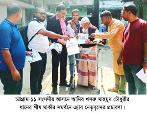 চট্টগ্রাম-১১ সংসদীয় আসনের আওতাধীন মাঝির ঘাট, কামাল গেট, কদমতলী, পাঠানটুলী, হালিশহরের আনন্দবাজার, ব্রিক ফিল্ড রোড, সিডিএ ২০ নাম্বার ব্রিজ, বড়পোল, পুরাতন ডাকঘর, বেগমজান স্কুল, মাইলের মাতা, এলাকা সহ বিভিন্ন স্থানে বিএনপি’র দলীয় প্রার্থী আমির খসরু মাহমুদ চৌধুরীর ধানের শীষ মার্কার সমর্থনে বিএনপি পন্থী প্রকৌশলী সংগঠন (এ্যাব) চট্টগ্রামের প্রেসিডেন্ট প্রকৌশলী সেলিম মো: জানে আলমে’র নেতৃত্বে পুরোদমেই প্রচার-প্রচারণা।