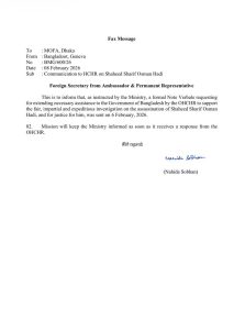পররাষ্ট্র মন্ত্রণালয়ের নির্দেশনা অনুযায়ী জেনেভাস্থ বাংলাদেশ স্থায়ী মিশন গত ৬ ফেব্রুয়ারি ২০২৬ তারিখে OHCHR-এর কাছে একটি আনুষ্ঠানিক নোট ভারবাল (Note Verbale) প্রেরণ করেছে। উক্ত নোটে হত্যাকাণ্ডের তদন্তে প্রয়োজনীয় কারিগরি ও প্রাতিষ্ঠানিক সহায়তা প্রদানের জন্য জাতিসংঘের মানবাধিকার দপ্তরের সহযোগিতা কামনা করা হয়েছে।