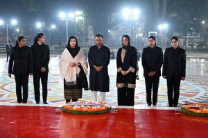 শুক্রবার (২০ ফেব্রুয়ারি) দিনগত রাত ১২টা ৮ মিনিটে কেন্দ্রীয় শহীদ মিনারে পুষ্পস্তবক অর্পণের মাধ্যমে তিনি ভাষাশহীদদের স্মৃতির প্রতি গভীর শ্রদ্ধা জানান। ঘড়ির কাঁটা ১২টা ছুঁতেই তিনি শহীদ মিনার প্রাঙ্গণে পৌঁছান।
