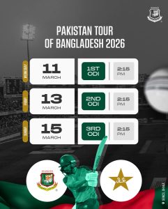 সবকিছু ঠিক থাকলে ৯ মার্চ ঢাকায় পা রাখবে সালমান আলি আগার দল। এরপর ১১, ১৩ এবং ১৫ মার্চ মিরপুর শেরে-ই বাংলা ক্রিকেট স্টেডিয়ামে তিনটি ওয়ানডে ম্যাচ অনুষ্ঠিত হবে। সবকটি ম্যাচই শুরু হবে দুপুর ২.১৫ মিনিট থেকে।