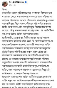আইন উপদেষ্টা আসিফ নজরুলের ফেসবুক পোস্টটি নিচে তুলে ধরা হলো: